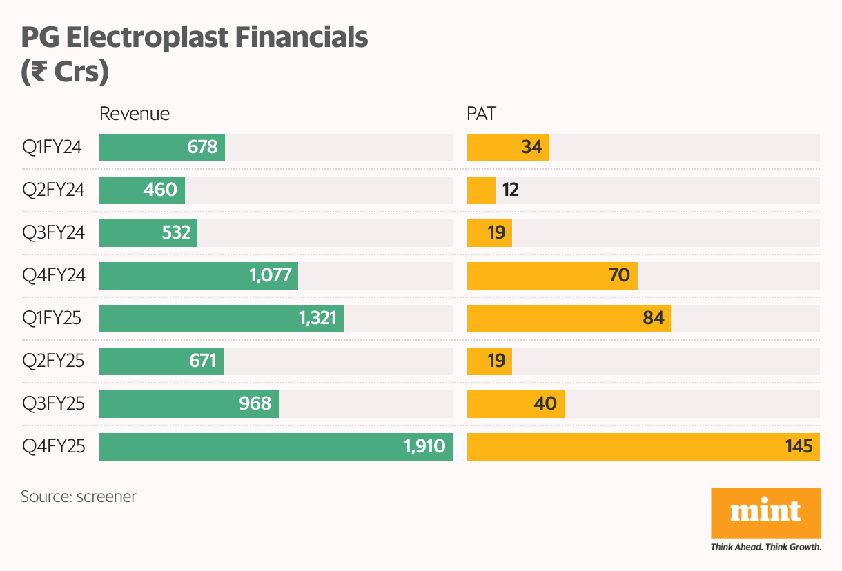 Every quarter, PG has delivered consistent revenue and profit growth of over 16% YoY from Q1FY24 to Q4FY25. That marks eight straight quarters of growth. During this period, revenue rose nearly threefold from ₹678 crores to ₹1,910 crores, while net profit jumped more than four times from ₹34 crores to ₹145 crores.