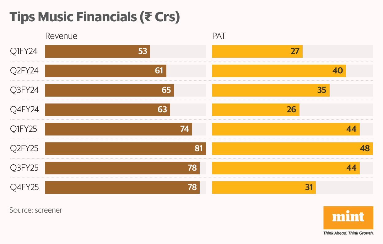 It ranks among the top five music companies in terms of YouTube subscribers and video views. Digital platforms account for around 72% of Tips Music’s revenue. Its revenue and profit both have grown at over 19% YoY, from Q1FY24 to Q4FY25. Revenue grew from ₹53 crore to ₹78 crore during the period, while profit rose from ₹27 crore to ₹31 crore.
