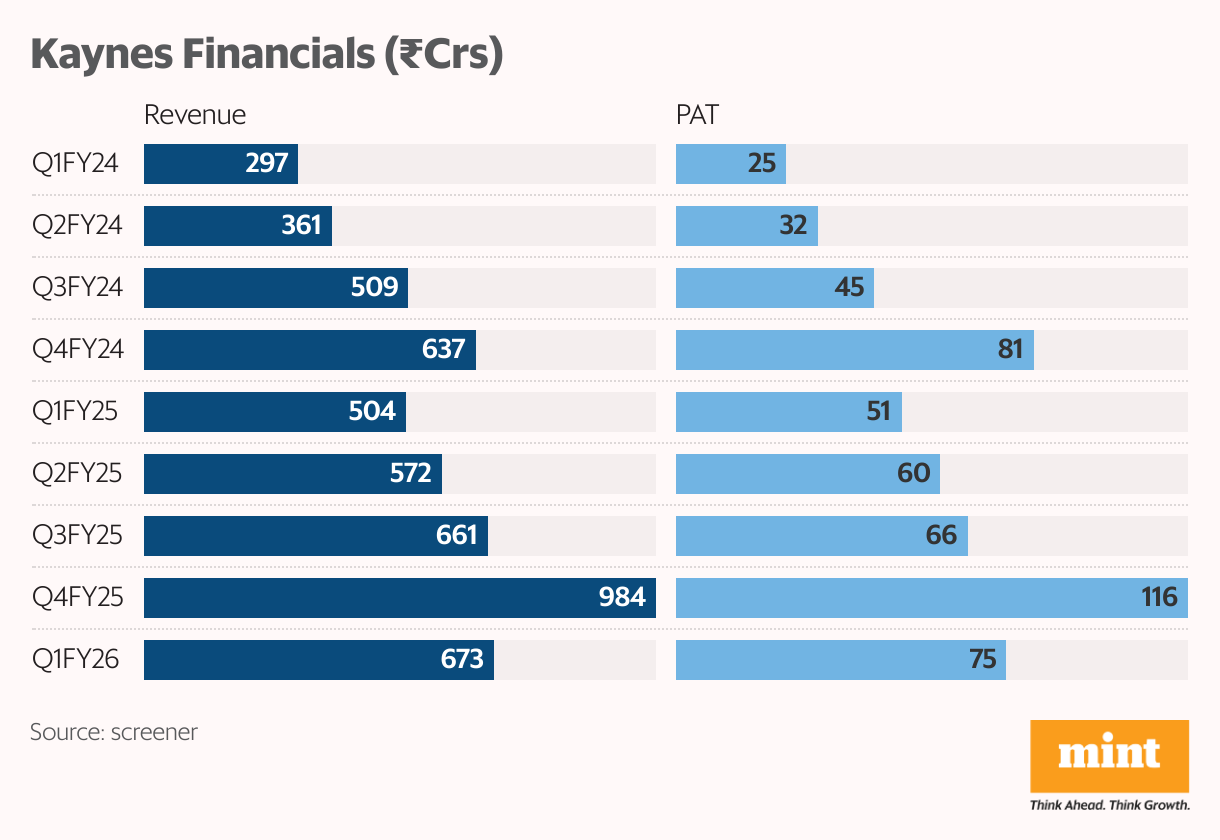 Kaynes revenue and net profit have grown consistently at over 30% YoY in every quarter from Q1FY24 to Q1FY26. Revenue nearly doubled from ₹297 crore to ₹673 crore during this period, while net profit increased from ₹25 crore to ₹75 crore. As a result, its share has returned 753% return in about 2.9 years.
