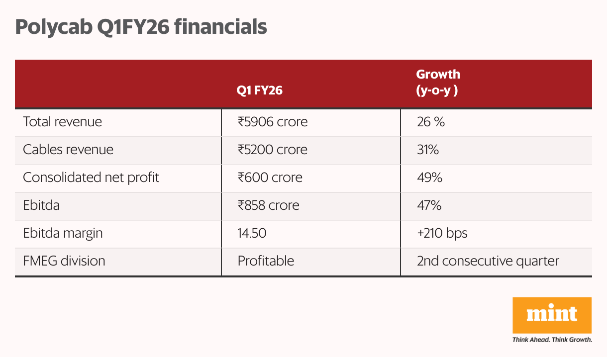 Revenue in the June quarter grew 26% year-on-year (y-o-y) to ₹5,900 crore, with the core cables business advancing 31%. Consolidated net profit reached ₹600 crore as Ebitda increased 47%, with Ebitda margins expanding 210 basis points to 14.5%. Ebitda is short for earnings before interest, taxes, depreciation, and amortization,